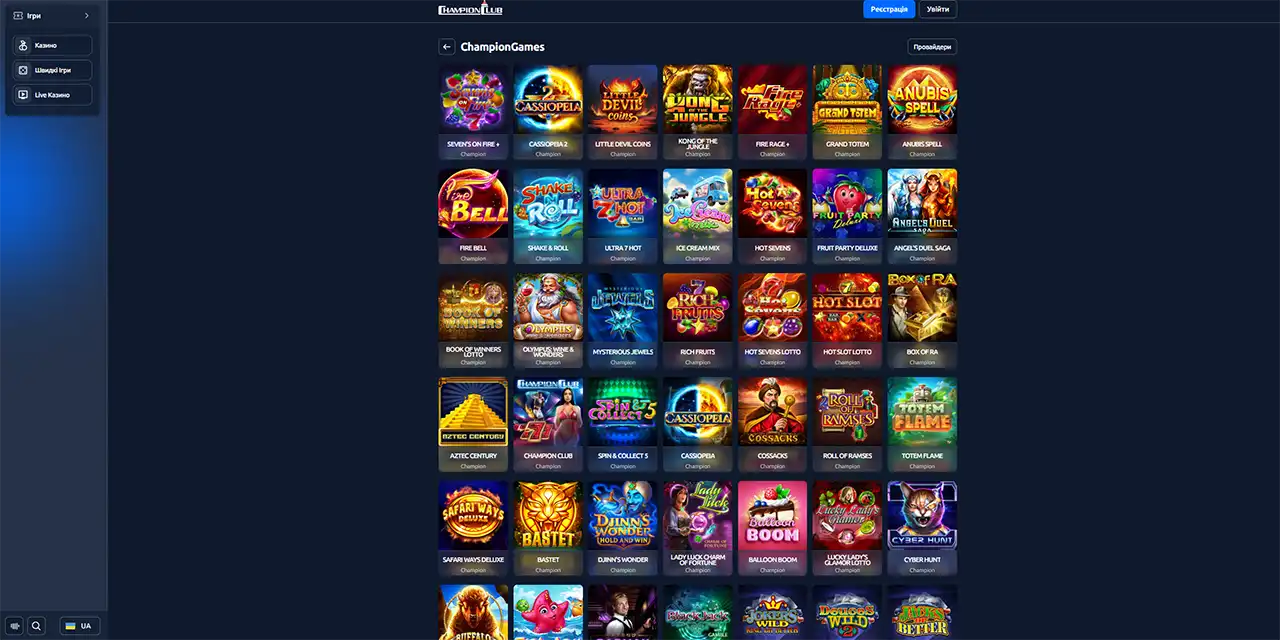Чемпіон клаб — це онлайн-ресурс, у межах якого ігровий контент представлений переважно слотами. Казино Чемпіон клаб формує власний каталог ігор із фіксованими технічними параметрами та централізованою системою доступу. Champion club використовує програмні рішення, що забезпечують однакову роботу ігор на різних пристроях. Ігрові автомати в Чемпіон клабі доступні після авторизації та відображаються в окремому ігровому розділі.